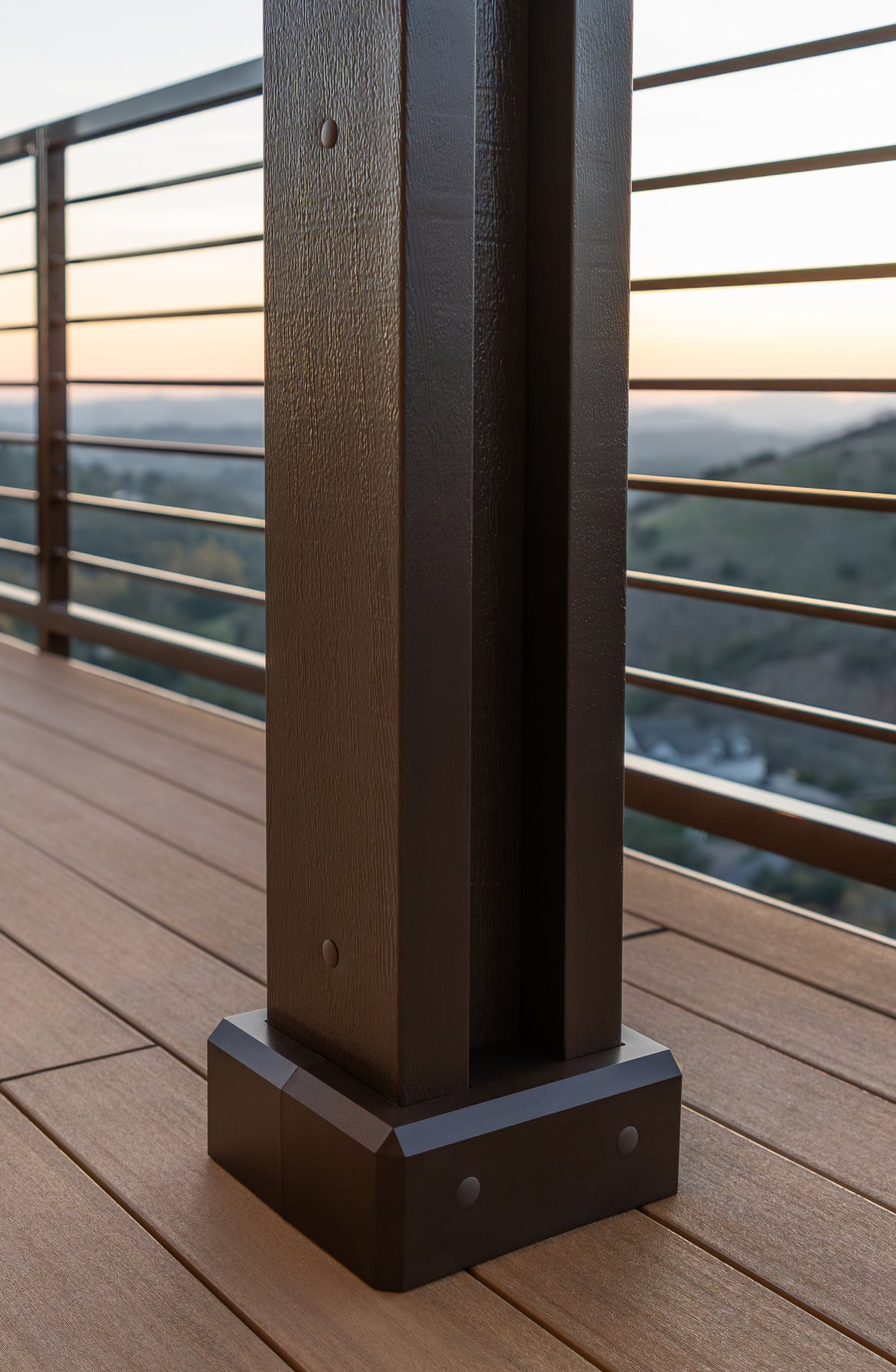 AlumaBase® is currently available in 11 standard colors. Two equal parts create one post base. The post base is attached through 3/16” pilot hole with four provided screws and finished with a cap.