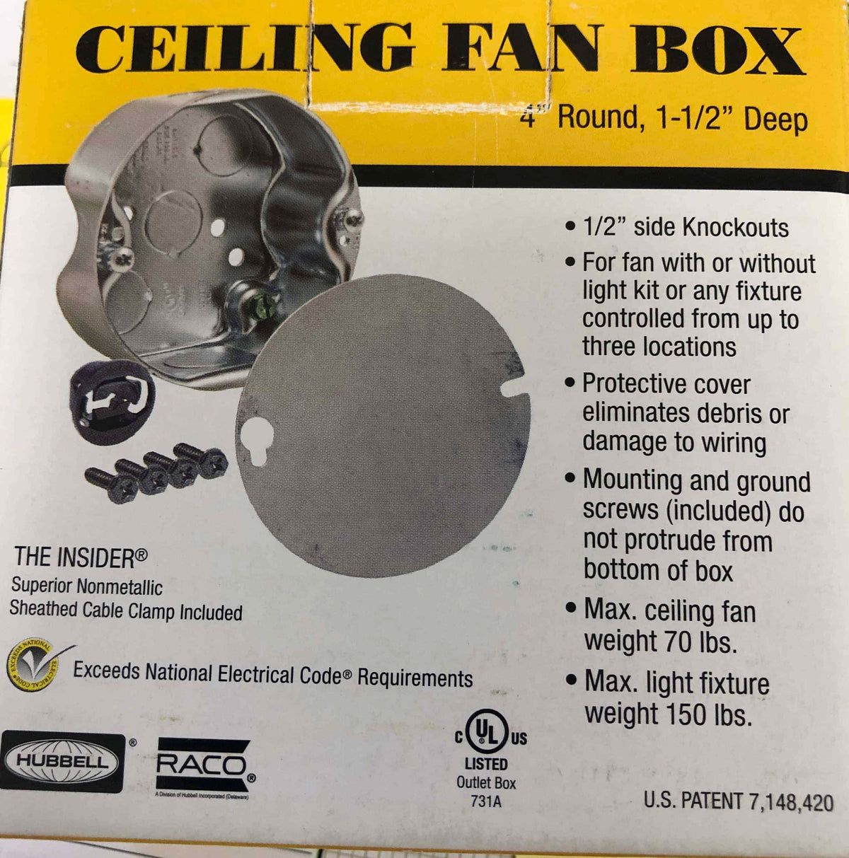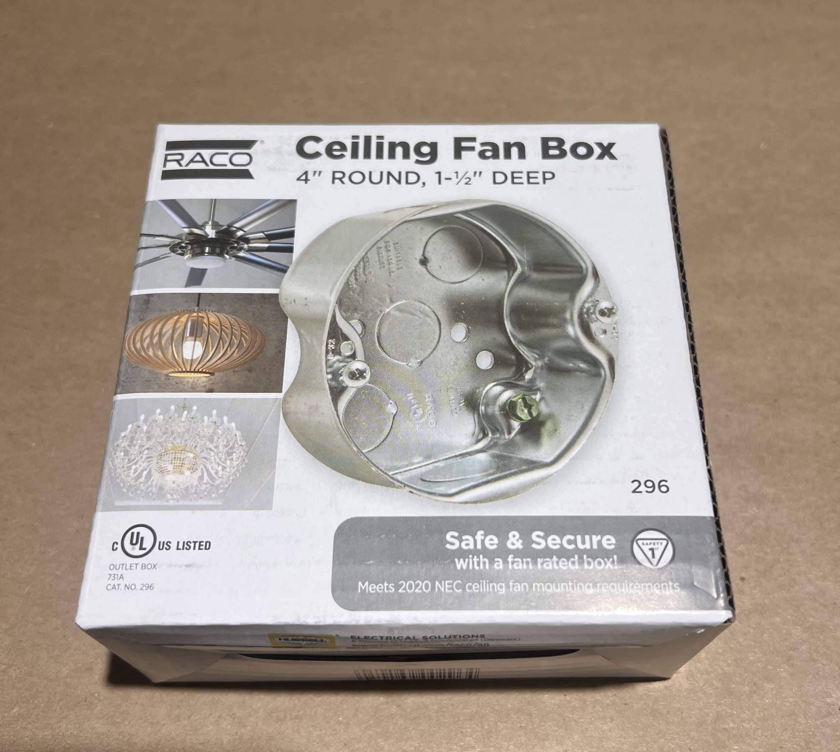 | Constructed of pre-galvanized steel. No protruding ground screw or fan mounting screws allows easy installation. Steel cover protects wires from damage, paint, and drywall compound during installation. Maximum support load for ceiling fans 70 lbs. and 150 lbs. for static light fixtures. #10-32, 1 in. long ceiling fan screws provided and provision for #8-32 fixture mounting screw. Easy to follow instructions and mounting hardware included. Supplied with five 1/2 in. knockouts; 1/2 in. side knockouts Width: 4 inches -- Depth: 1-1/2 inches --Height: 4 inches Conduit Size: 1/2 inch -- Capacity: 15.8 cu in |